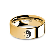 The shadow and the light of the yin yang symbol from Chinese Taoism represents the balance we should strive for in our lives. Wear this yin yang symbol as a daily reminder on a beautifully crafted scratch-resistant gold tungsten carbide ring, engraved by a precision laser by Hanover Jewelers. The perfect tungsten carbide wedding band or engagement ring in a polished finish for that special someone. Features: flat surface with pipe cut edges, laser engraving, gold ion plating. Thickness: 1.5 mm - 2.3 mm. Weight: 3 - 16 grams. Engravable: Yes.