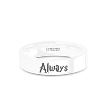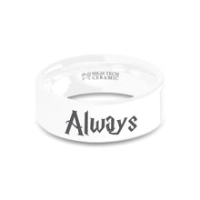 Express your love in a wizardly way: with an affectionate "Always" written in lightning bolt wizard font. This ring is laser-engraved on a precision made scratch-resistant white ceramic band proudly brought to you by Hanover Jewelers. The perfect ceramic wedding band or engagement ring in a polished finish for that special someone. Features: flat surface with pipe cut edges, laser engraving. Thickness: 1.5 mm - 2.3 mm. Weight: 3 - 7 grams. Engravable: Yes.